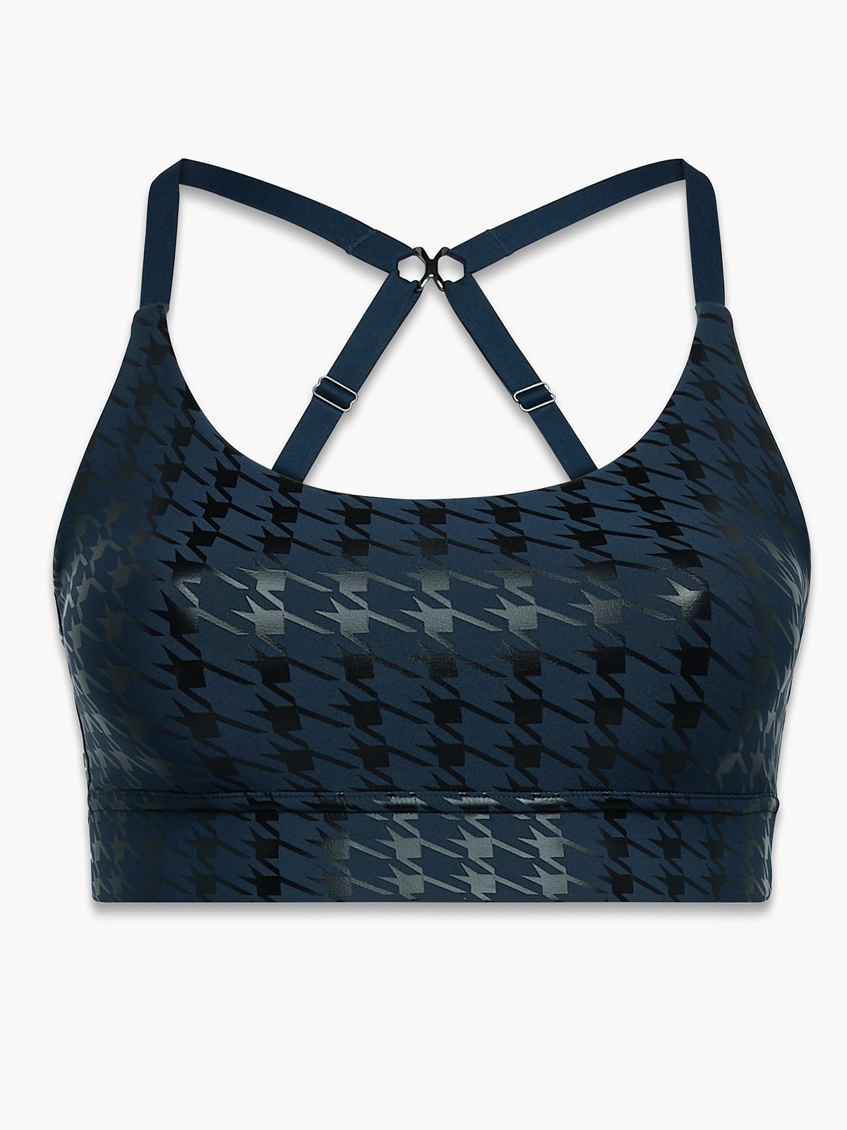 Stay one step ahead in our Band-It Houndstooth Low-Impact Sports Bra, featuring an allover metallic houndstooth print, a wide, encased elastic underband, and adjustable cross-back straps.