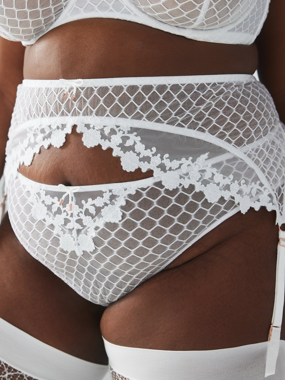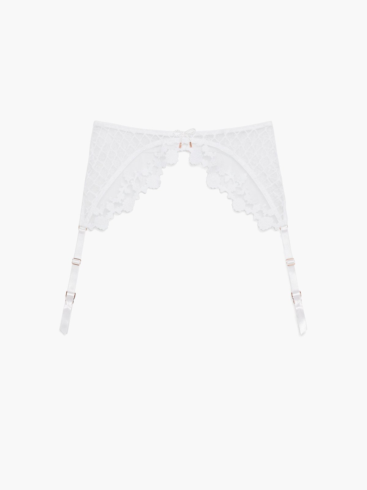 - Adjustable garters with satin flashes and rose gold-tone hardware