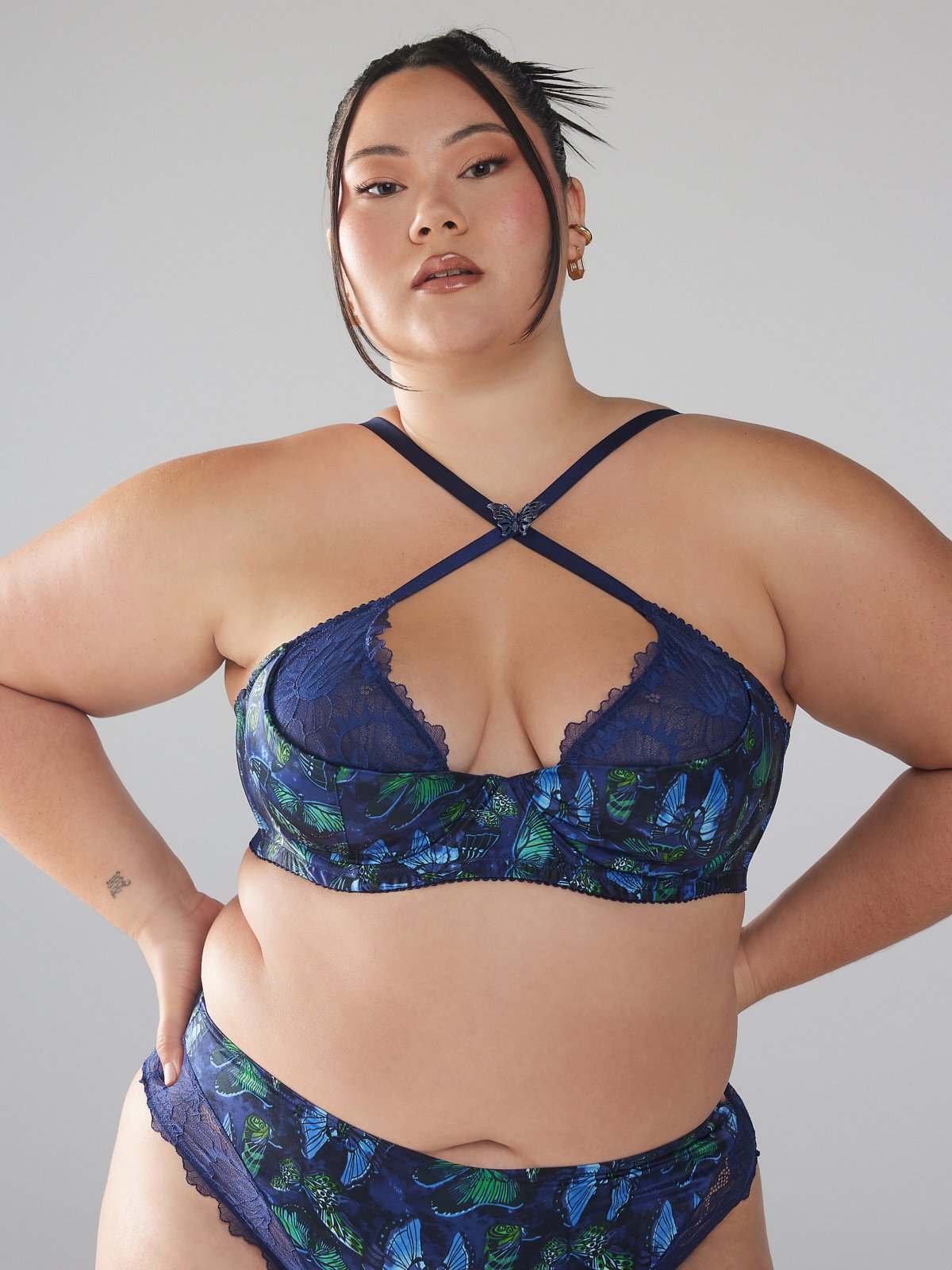 Enter your new element with our Baroque Butterfly Lace Quarter-Cup Bra, featuring a padded quarter cup with an unlined, lace top cup, a satin body, and a halter neckline with adjustable, supportive straps that cross in front and back.