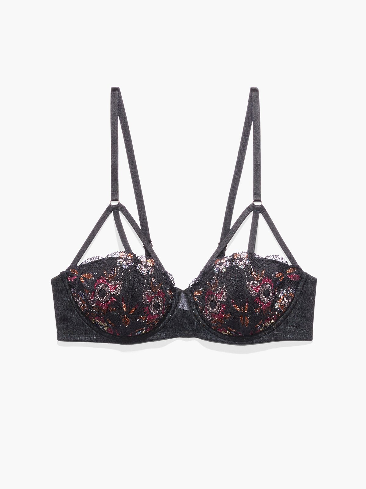 Xpose your deepest desires in our Nymph Nouveau Lace Balconette Bra featuring caged details at padded cups, a power-mesh back wing, adjustable straps, and rose gold-tone hardware.