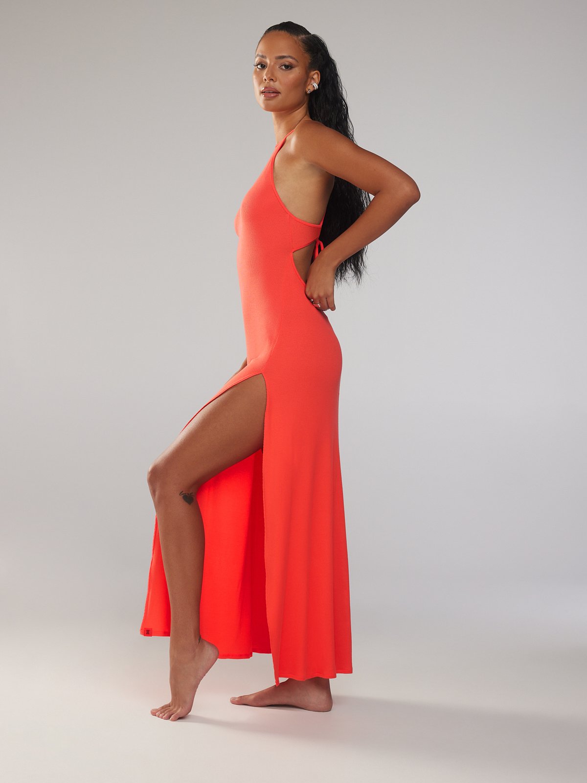 Laidback, but always ready to stunt. Our Rib Essentials Maxi Slip features a halter neckline, adjustable strappy back, and high slit.
