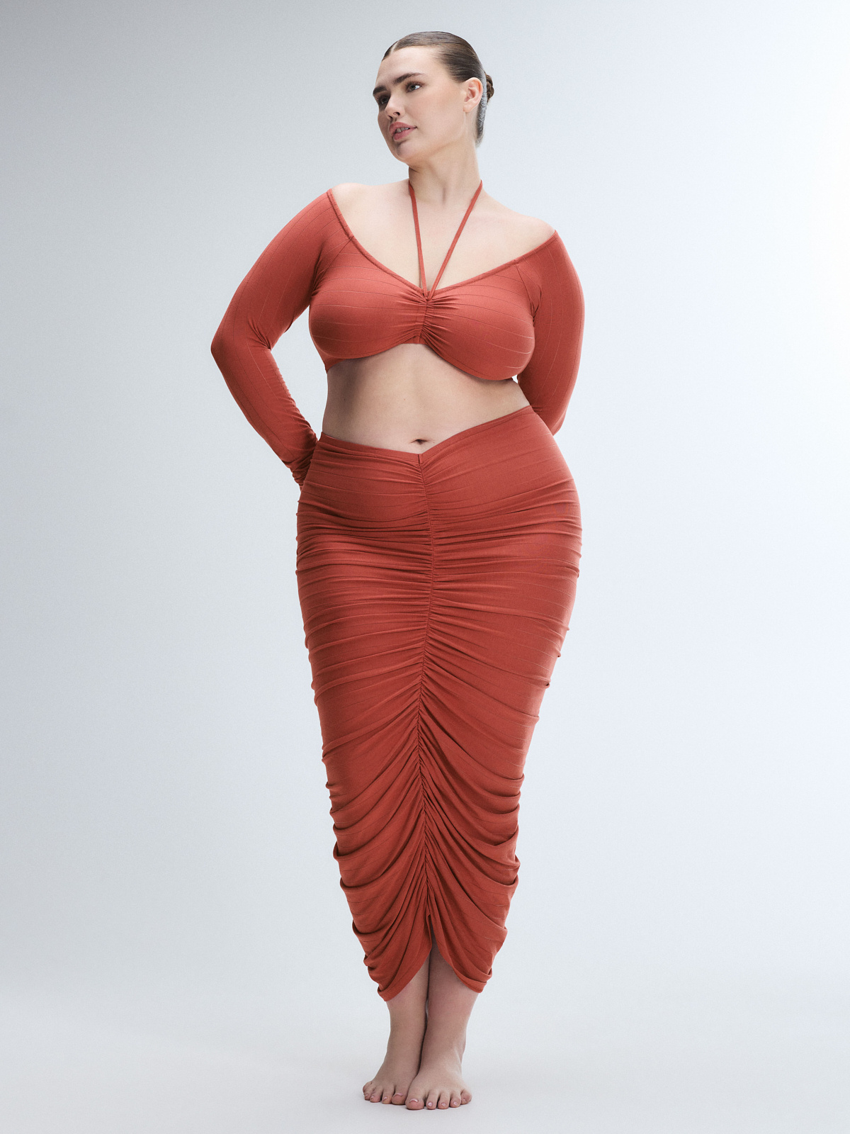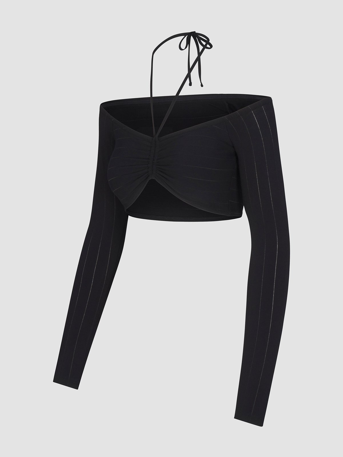 The sleekest touch. Our versatile Sleek Stitch Ruched Top is made from a lightweight modal fabric and features a cropped, long-sleeve silhouette, adjustable front seam ties, and an elastic hem. Wear it on or off the shoulders-the silicone along the neckline offers a secure fit.