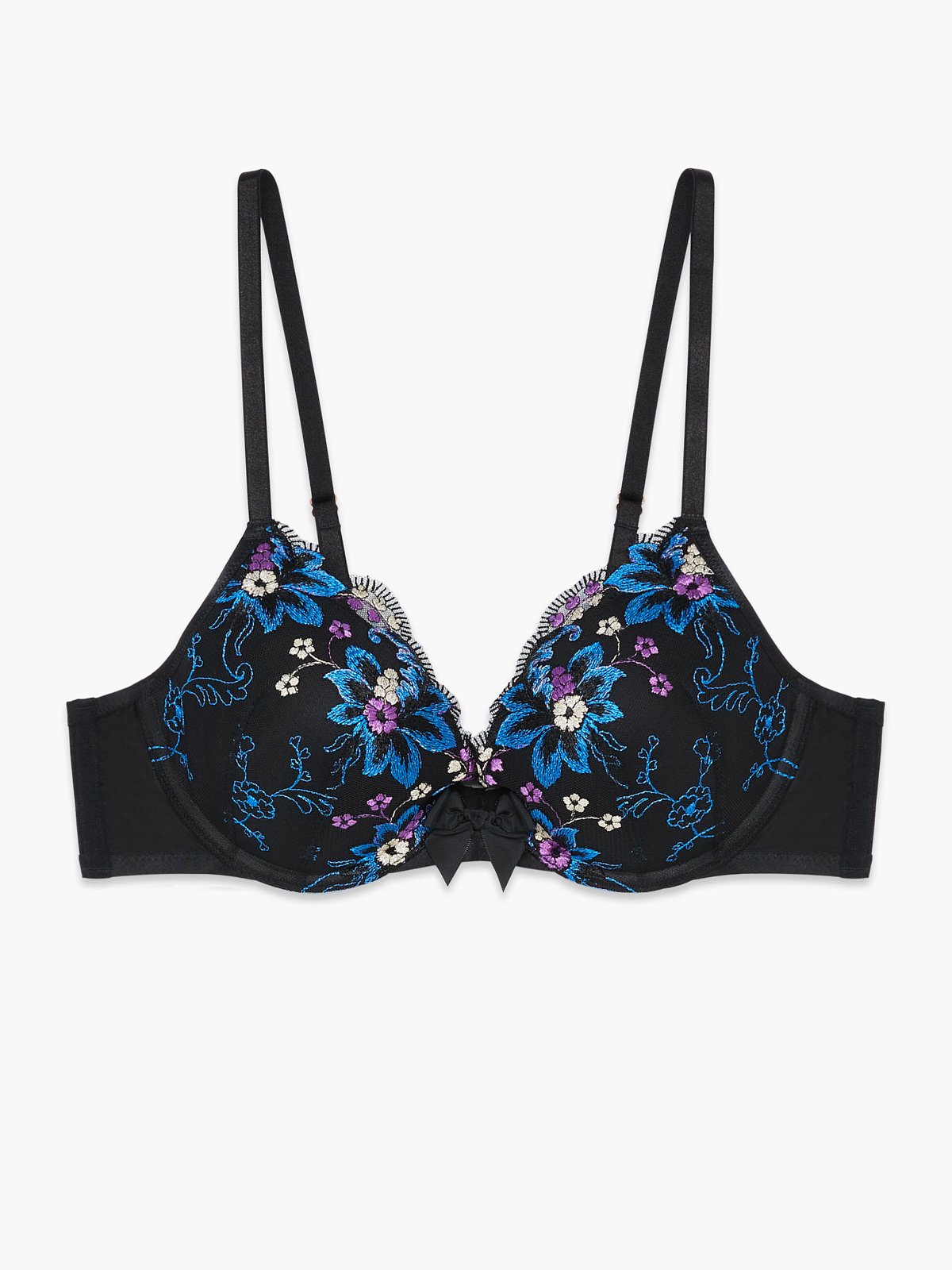 Experience the enchantment of the Wallflower Padded Push-Up Bra, featuring a plunge neckline, custom Savage X floral embroidered cups, sheer tricot wings, power-mesh back body, adjustable straps, and rose gold-tone hardware.
